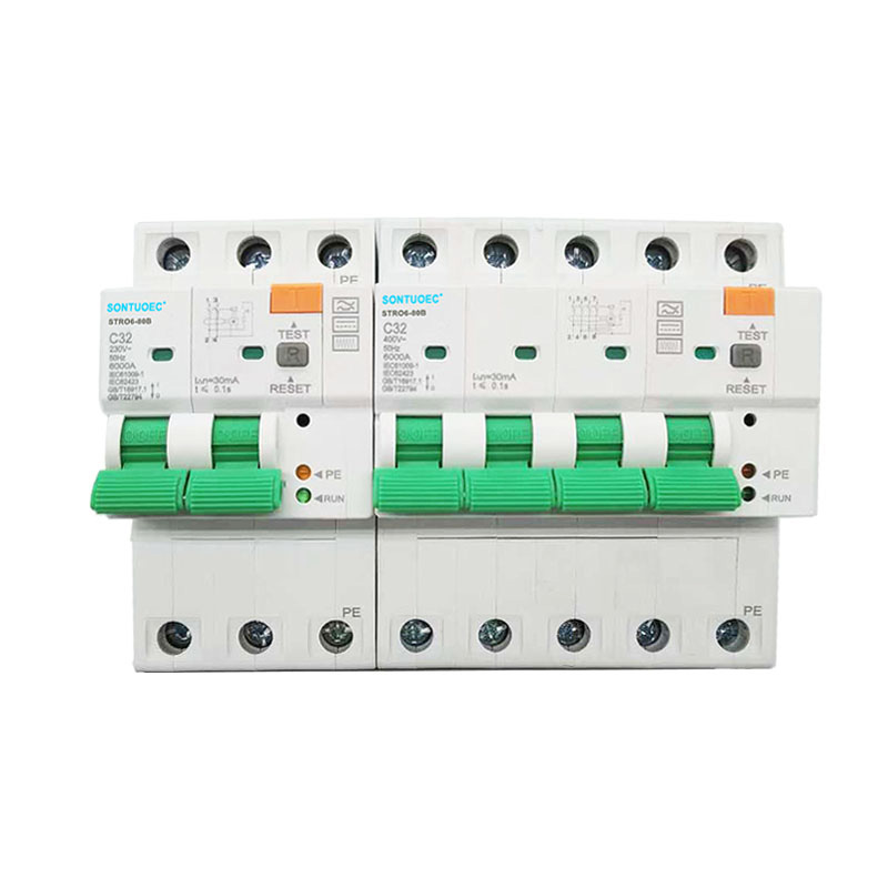 Абарона ўцечкі: RCBO Stro6-80B здольны выяўляць рэшткавы ток (г.зн. ток уцечкі) у ланцугу. Калі рэшткавы ток перавышае ўстаноўлены парог, RCBO B Model 2P 4P Рэшткавы выключальнік току будзе адрэзаць схему за вельмі кароткі прамежак часу, каб прадухіліць здарэнні электрычнасці і электрычныя пажары.