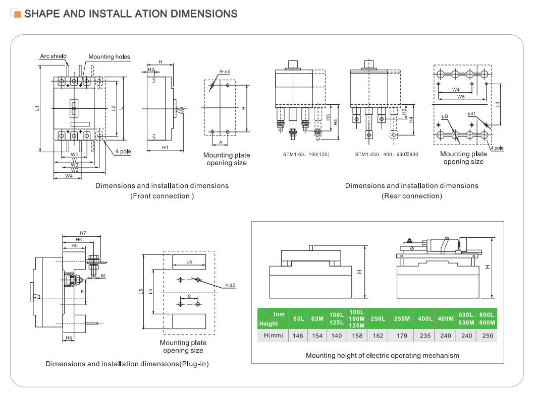 Функцыя: электрычны выключальнік у літым корпусе мае розныя функцыі абароны, такія як абарона ад перагрузкі, абарона ад кароткага замыкання, абарона ад паніжанага напружання і абарона ад уцечкі. Сярод іх абарона ад перагрузкі азначае, што пры перагрузцы ланцуга выключальнік можа аўтаматычна адключаць ланцуг, каб прадухіліць пашкоджанне абсталявання з-за перагрэву; абарона ад кароткага замыкання азначае, што калі ў ланцугу адбываецца кароткае замыканне, аўтаматычны выключальнік можа хутка адключыць ток замыкання, каб прадухіліць пажар і іншыя няшчасныя выпадкі; абарона ад паніжанага напружання азначае, што калі напружанне крыніцы харчавання ніжэй за намінальнае значэнне, выключальнік можа аўтаматычна адключаць ланцуг, каб абараніць абсталяванне ад пашкоджання; а абарона ад уцечкі азначае, што калі ў ланцугу адбываецца ўцечка, аўтаматычны выключальнік можа своечасова адключыць падачу электраэнергіі для абароны асабістай бяспекі. Абарона ад уцечкі азначае, што аўтаматычны выключальнік можа своечасова адключыць падачу электраэнергіі, калі ёсць уцечка ў ланцугу для абароны асабістай бяспекі.