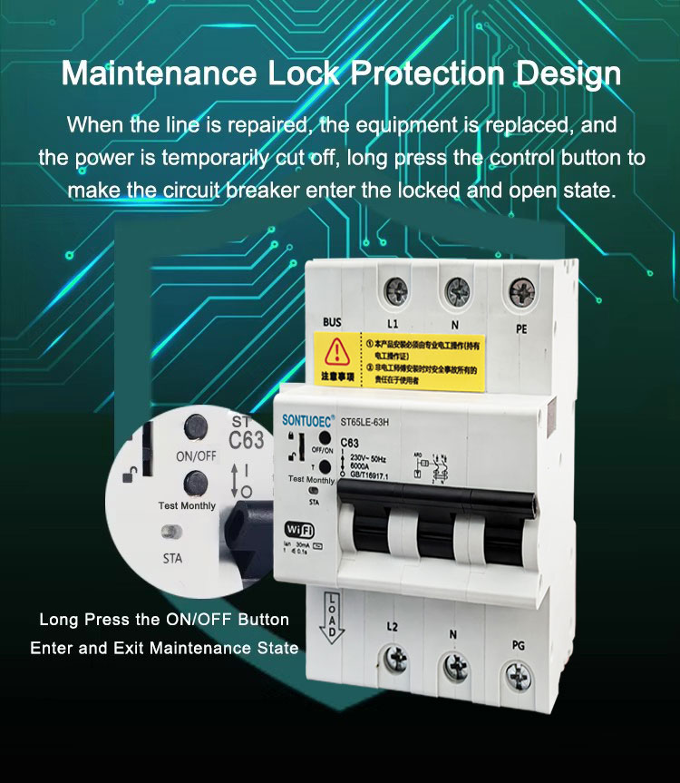 Гэты серыя Wi-Fi 4G Tuya ST65LE-63H Шматфункцыянальны інтэлектуальны выключальнік RCBO падыходзіць для контуру 50 Гц/60 Гц, схемы 230/400V 0 ~ 125A, якія маюць такія функцыі, як абарона ад перагрузкі, абарона ад кароткага закруткі і абарона ўцечкі. Між тым, гэты інтэлектуальны выключальнік для перазагрузкі мае функцыю, як пераключэнне OOF/на глабальным дыстанцыйным кіраванні па смарт -мабільным тэлефоне.